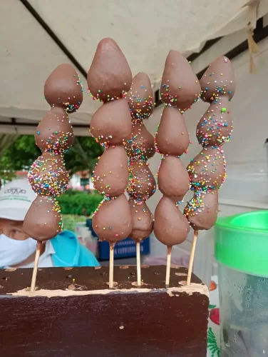 Cuajada con dulce, merengones, obleas, fresas con crema, postres saludables, arepas de maíz peto y maíz pelado, lechona